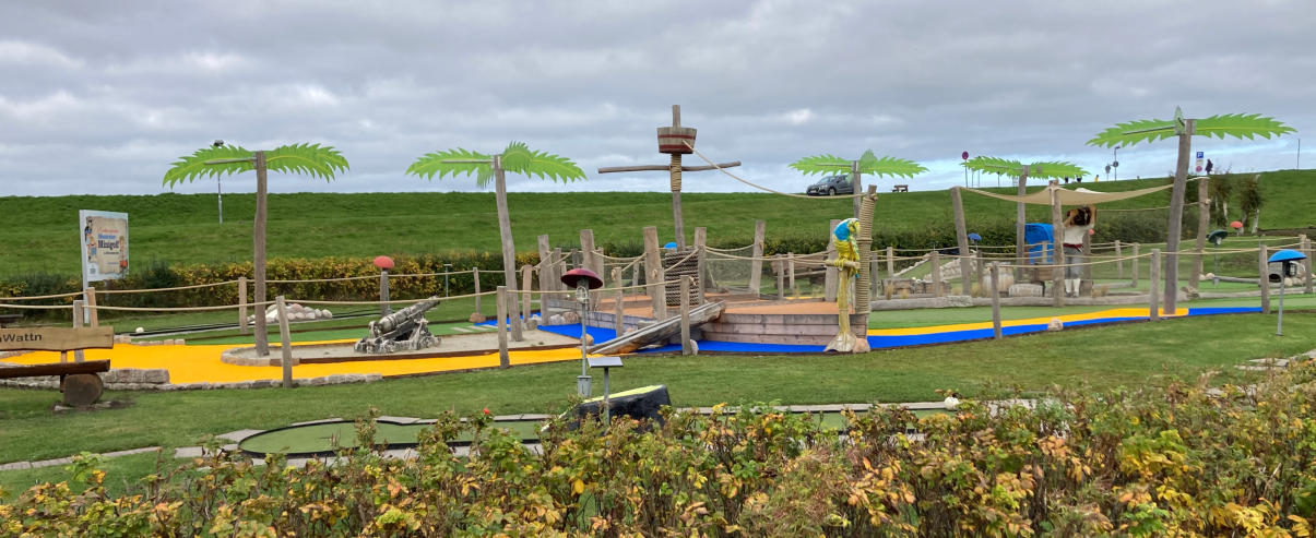 Piraten Golf HA WATTNHotel HaWattnHafenstraße 726553 DornumersielElektronische Postadresse:info@hawattn.deKommunikation:Zentrale: Tel.: 04933 8159PASST AUF EUCH AUF!ARR! meine Kameraden.Da versenk mich doch einer!Die Piraten haben es tatsächlich bis in den Hafen von Dornumersiel geschafft und haben die Minigolfanlage überfallen.Umrandet von einer grünen Gartenlandschaft sind insgesamt 27 Bahnen mit verschiedenen Hindernissen wie Sand, Findlingen, Wasser und Kies anspruchsvoll gestaltet. Die gesamte Spiellänge der Bahnen beträgt über 350 Meter, die längste Bahn ist dabei mehr als 25 Meter lang. Auf den 17 Minigolf-Bahnen spielen sie auf Golf-Kunstrasen, ein noch anderes Spielgefühl.Spielt z.B. in einem versunkenen Schiffswrack oder über einen Bachlauf.Auch die Abenteuerbahnen sind stilvoll in das Gelände modeliert, wobei Hindernisse und Erhebungen geschickt umspielt werden müssen. Die Anlage vermittelt ein völlig neues Spielgefühl im Bereich Minigolf, fast so wie beim echten Golf. Der Kunstrasen auf den Abenteuerbahnen ist komplett begehbar und hat wie beim echten Golf einen erhöhten Bereich (Rough).Alles ist im Piratenstil liebevoll gestaltet und vermittelt ein echtes Nordsee-Urlaubs-Gefühl.Für jedes Alter sind Schläger und Bälle erhältlich.Wir freuen uns auf euch!ARR!