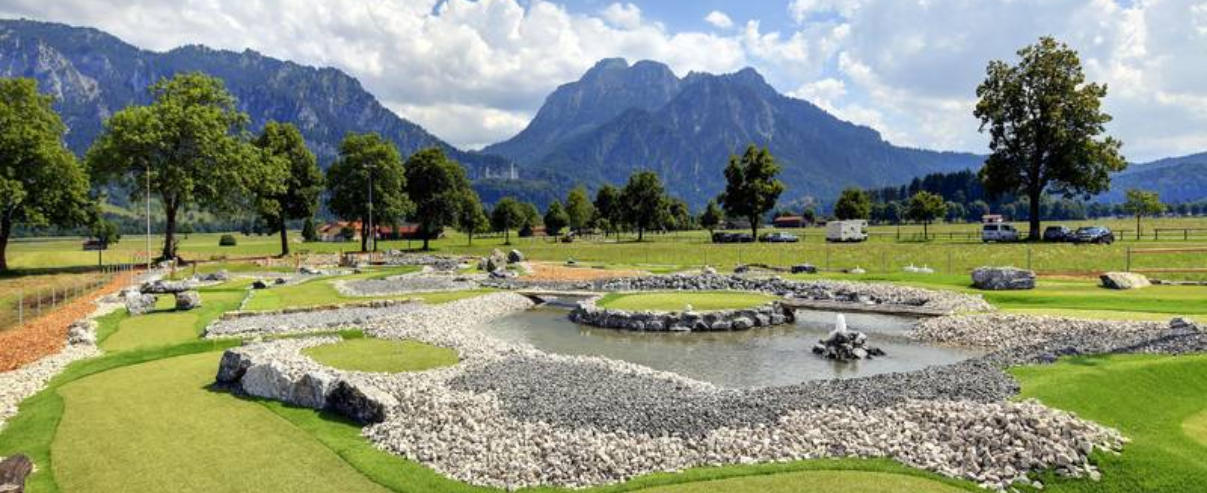 Schlossbrauhaus SchwangauGipsmühlweg 5 87645 SchwangauTel. 08362 926468-0info@schlossbrauhaus.deAdventureGolf mit grandiosem Blick auf das Schloss Neuschwanstein. Mit einzigartigem Blick auf die Königsschlösser entstanden hier 18 Bahnen mit hochwertigem Kunstrasen in einer Gartenlandschaft.Es ist ein Spielerlebnis für Jung und Alt und für Kinder ab 4 Jahren geeignet.Nach oben gibt es keine Altersgrenze.Zwischen den Bahnen gibt es Ruhebänke, falls der Wettkampf zu turbulent wird.Ein zusätzliches Highlight ist sicher die Beleuchtung der Anlage.Während bei anderen Golfanlagen bei Sonnenuntergang die Bahnen hochgeklappt werden, kann auf der Schlossgolf-Anlage bis 22 Uhr gespielt werden.SchlossGolf am Schlossbrauhaus Schwangau. Erlebe die Freude amSpielen, gepaart mit den kulinarischen Köstlichkeiten und eigens gebrautem Bier im Biergarten oder der Gaststube.