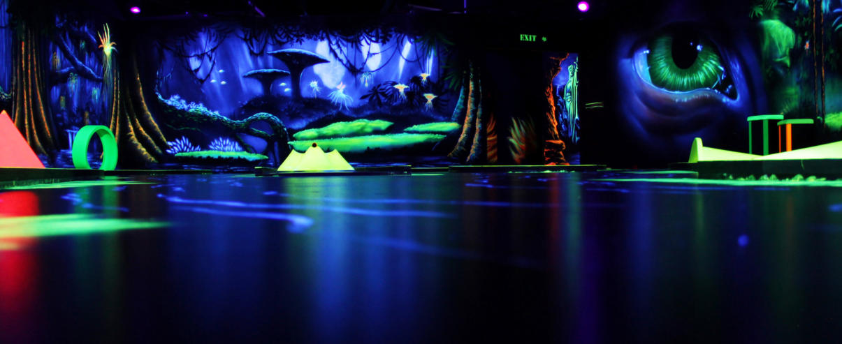 Schwarzlicht Golf - Indoor Anlagen sind bereits auf einer Fläche ab